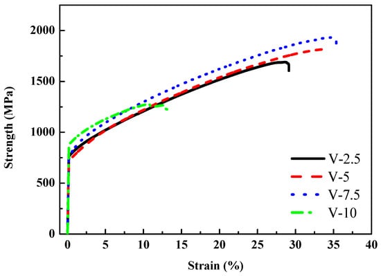 Mechanical compressive stress–strain curves of the Al50Ti20Cr10Mn20-xVx (x = 2.5, 5, 7.5, 10) alloys.