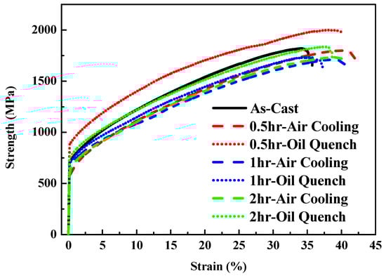 Figure 12 depicts the strength–strain curves of Al50Ti20Cr10Mn15V5 annealed at 1000 °C for 0.5, 1, and 2 h, followed by air-cooling and oil-quenching. Through the annealing treatment, the plastic strain of Al50Ti20Cr10Mn15V5 increased slightly. Notably, the annealed and oil-quenched Al50Ti20Cr10Mn15V5 exhibited extraordinary compressive strength and ductility (1966 MPa and 40%). The compressive test results and phase fraction are summarized in Table 4. The oil-quenching process significantly improved the compressive strength of the MEAs through fraction evolution and the morphology of the BCC phase, as presented in Figure 13. The oil-quenching process induced higher strength in the MEAs compared with the air-cooling process. It supposed that the increase of BCC fraction which was attributed to rapid cooling rates led to increase in strength. However, with increased annealing time, the phase morphology become more rounded and the strength decreased slightly. For improving the mechanical properties through manipulation of phase morphology, the quenching approach was more effective than annealing time in this study.