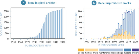 (a) Graphical representation of the trend in journal publications on bone-inspired design from 1950 to 2020. (b) Other bone-inspired studies categorized as books, clinical trials, conference proceedings, reports, patents, etc.