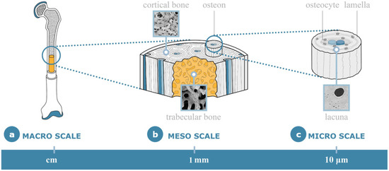At the macroscale, bones are organs belonging to the skeletal system. They perform relevant functions such as protecting internal organs, acting as a scaffold for muscles and for calcium storage, allowing movement and supporting body weight. At this gross anatomy scale, it is possible to distinguish structural features by naked eye and classify bones according to their shapes: long bones (e.g., femur, humerus), short bones (e.g., vertebra, carpal) and flat bones (e.g., frontal, rib, ilium). At the mesoscale, bones are categorized generally as cortical (compact) and trabecular (spongy) structures. The most evident difference between the two is associated with their different surface–volume ratios [22]. Cortical bone is found mostly in the diaphysis of long bones and surfaces of flat bones [23]. The porosity of cortical bone accounts for the presence of blood vessels, canals and cells, and it counts for about 5% of the cortical volume [24]. Compact bone is organized in osteons, parallel cylindrical structures made up of concentric layers (lamellae) packed together around a central canal (Haversian canal). Haversian canals are microscopic tubes with a diameter of around 200 μm [25] containing blood vessels and nerves. Neighboring Haversian canals are transversally interconnected by vascular channels named Volkmann’s canals. Trabecular bone, on the other hand, is a porous tissue with a surface–volume ratio much higher than the one in cortical bone [26]. This spongy tissue is predominantly found at the extremities of long bones and inner parts of the flat bones.