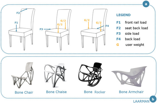 (a) Schematic representation of the loads applied during the testing phase of chairs. The user weight is considered as an additional variable. Several configurations are considered, such as the loading of the front rail (F1) and the seat back (F2), the side loading (F3) and the back loading (F4). (b) Laarman’s bone-inspired chair collection.