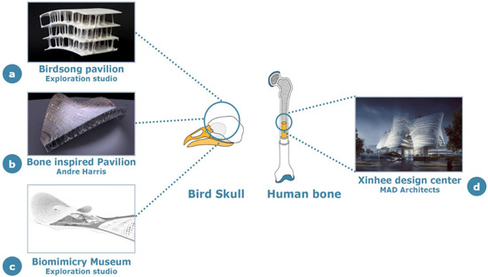 Among the natural bones available in nature, bird bones have particularly attracted the attention of architects thanks to their significant lightness and mechanical strength. Bird bones are extremely lightweight biological materials, and their structure can span multiple length scales while maintaining high stability [48,49,50]. They have an unusual combination of structural features, ranging from small- to large-scale multilayered organization, balancing their lightness with bending stiffness, torsional stiffness and strength of the whole structure [49]. Distinct bones of bird skeletons exhibit different densities, providing a more reasonable distribution of forces and better support for the specific activities of the corresponding species. This feature has been used in many design concepts, including the design of garments and buildings; in the latter category, bird bones have especially inspired roof architecture due to the large span and the strict requirements for lightness and structural stability, as schematized in Figure 6. Several of the following architectural applications are still at a preliminary concept level or are under assessment for realization.