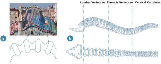 Aesthetic bone-inspired application in the architecture field: (a) Casa Batlò in Barcelona (Spain); (b) schematization of the concept: the cornices are arranged in a geometry that resembles human vertebrae.