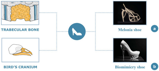 Bone’s peculiar mechanical properties and intrinsic symbolic implications have been considered in the garment field for structural applications, typically for items that are subjected to compression such as footwear. There are two notable representative examples of bone-inspired structures used in the design of shoes. The first example is the “Melonia Shoe” [59] (Figure 9a), a creation of the fashion designer Naim Josefi and the industrial designer Souzan Youssouf, displayed at Mercedes-Benz Fashion Week (Stockholm 2010). The second case is the “Biomimicry Shoe” [60] that is a product of collaboration between fashion designer Marieka Ratsma and architect Kostika Spaho (Figure 9b).