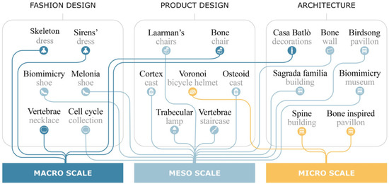The three different scales of the bone structure appear to be mutually employed within the investigated fields of product design, architecture and garments in both aesthetical and structural applications (Figure 11). In particular, it is interesting to note that the macroscale architecture of bone has a wide range of applications, although they are exclusively of an aesthetic nature. Over time, the macroscale has in fact assumed strong cultural and symbolic connotations that have made it an expressive and strongly evocative element for designers and artists. A more careful analysis shows a clear prevalence of interest in mesoscale features: among the analyzed case studies, 11 of them refer to the mesoscale bone characteristics, 6 correspond to macroscale bone characteristics and 3 relate to the microscale aspects of bone structure. The use of the mesoscale is indeed an optimal compromise between the advantages derived from the application of a bone-inspired structure and the density of the lattice. It is no coincidence that this solution finds greater applications in the field of architecture where the high dimensions of the architectural works allow the reticle to be reproduced on a large scale and make it easily reproducible even with the use of traditional construction techniques.