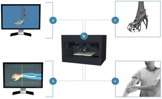 (a) The shape of the subject’s foot/arm is scanned (b) A 3D model of a shoe/cast is generated to exactly fit the shape of the foot/arm and is 3D printed (c) A customized final product is obtained.