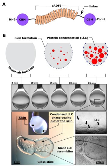 - Mohammadi, P.; Christopher, J.; Beaune, G.; Engelhardt, P.; Kamada, A.; Timonen, J.V.I.; Knowles, T.P.J.; Penttila, M.; Linder, M.B. Controllable coacervation of recombinantly produced spider silk protein using kosmotropic salts. J. Colloid Interface Sci. 2019, 560, 149–160. [Google Scholar] [CrossRef]