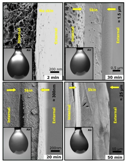Self-assembly and evolution of skin at the water–air interface. SEM images of the cross-section of the pendant droplets of 2% w/v silk solution after 2 min, 20 min, 30 min, and 50 min. The skin layer is indicated in-between two yellow arrows for all images. For each time point, we have also included representative images of each pendant droplet.