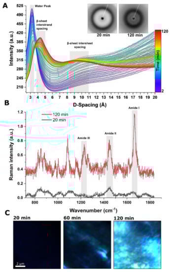 To investigate the structural features of the skin at the molecular scale, we followed in situ self-assembly of the protein at the water–air interface using synchrotron WAXS measurements. Figure 3A shows representative time-resolved 1D WAXS curves extracted from 2D diffraction patterns corresponding to Figure 2. The measurement was expanded up to 120 min. Scans were performed every minute at 500 µm underneath the blunt needle tip at the center point, keeping the position fixed throughout the measurement. At the onset of the measurement, a strong signal corresponding to the so-called water peak could be seen with the D-spacing ranging from 3 to 3.5 Å [36,37]. Over time, scattering intensity declined due to the gradual evaporation of the water molecules. This gradually resulted in the emergence of the two visible peaks towards the last scans. A sharp peak between 4 and 5 Å, with the maximum peak intensity at around 4.5 Å, is known to correspond to β-sheet interstrand spacing, as described previously, by combining experimental and computational simulation [19,38,39,40], A broader peak appeared between 8.5 and 11 Å, with its maximum intensity at 10.6 Å. This spacing is commonly assigned to β-sheet interspacing. As the content of β-sheet structures was rising during the drying process, water loss and drying can be interpreted as the key triggering mechanism for crystallization [18,38,39,40]. These observations are in agreement with complementary RAMAN spectroscopy measurements to determine the conformationally sensitive amide I signal which has been dominantly assigned to β-sheet structures with an emerging peak at a wavenumber of 1657 cm−1 (Figure 3B) [41,42]. Additionally, performing polarized microscopy of the skin at various time points placed between two crossed polarizers at 45° with respect to their axis demonstrated an increase in the birefringence of the samples over time, indicative of conformational conversion and evolution of β-sheet motifs (Figure 3C).
