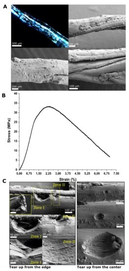 Rolling the skin into fiber-shaped material and testing its mechanical properties. (A) Polarized microscopy of a fiber-like material made from the skin. The panel also shows SEM images from three different regions of the same fiber which demonstrates inhomogeneity in the thickness and surface morphology throughout the length of the fiber. (B) Representative stress–strength curve for the corresponding sample as in (A). (C) SEM images of the material after the tensile measurement test illustrating typical tears observed throughout the length of the fibers.