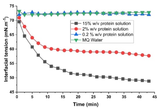 To better understand the absorption kinetics of the protein at the water–air interface, we performed pendant drop tensiometry for the protein solutions at the various concentrations (Figure 5). In addition to what we indicated as a saturated silk solution (2% w/v), we also tested very dilute (0.2% w/v) and highly concentrated (15% w/v) solutions. We also included MQ water as a control. Data obtained from the DST measurements revealed two distinct trends illustrating the absorption of the protein at the water–air interface, very similar to what is known for surface-active proteins [44,45]. First, with the increase in protein concentration, we noted a substantial decrease in surface tension. Second, surface tension decreased substantially as the droplets were incubated for a longer period. These were only pronounced for 2% w/v and 15% w/v. DST data points for the 0.2% w/v sample remained nearly constant at around 72.5 mN m−1, indicating that there is no apparent absorption of the proteins at the interface. Data for 0.2% w/v was nearly identical to the MQ water. Both 2% w/v and 15% w/v showed a similar trend in the evolution of the interfacial tension. This includes a steep initial decrease in the surface tension, followed by a very gradual reduction for the rest of the measurements. However, we also observed a few noticeable differences. For instance, surface tension for the 2% w/v decreased from 71 to 58 mN m−1, whereas this was ranging from 69 to 47 mN m−1 for the 15% w/v protein solution. Additionally, the initial plunge was expanded for around 10 min for the 2% w/v, whereas this was about 20 min for 15% w/v sample.