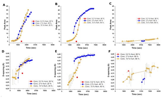 Samples with 2% and 15% w/v at 20 and 40% RH showed a clear appearance of β-sheet structures over time. Both 2% and 15% w/v samples showed relatively similar development of β-sheets over time, with the differences that samples with 15% w/v reach a higher content of β-sheets in comparison to 2% w/v in most humidities. However, it is notable that the 15% w/v sample showed a lower slope (Figure 6A–C) of the peak area, increasing overtime at the onset of measurements. Seidel et al. showed that a peak position at around 4.4 Å is correlated to silk with only isolated or partially stacked β-sheet structures, while materials (usually after drawing) with larger microcrystals exhibit a peak for lateral distance at 4.6 Å. Therefore, not only larger peak areas, but also higher peak positions (larger D-spacing) can be assumed to correlate with a higher degree of ordering of β-sheets [38]. In general, D-spacing rises overtime for all samples (Figure 6D–F).