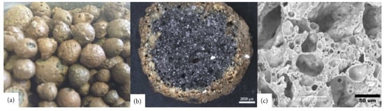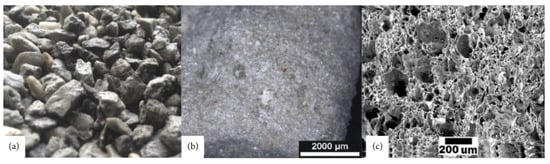 Artificial LWA produced from expanded clay (aliven): (a) real scale, (b) micrograph to 32×, and (c) SEM micrograph to 500×, adapted with permission from ref. [].