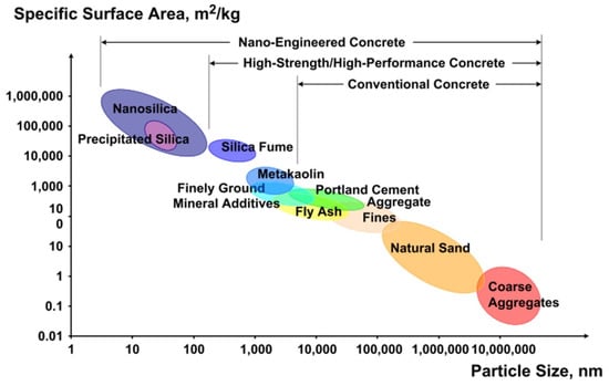 Particle size and specific surface area related to concrete materials, reprinted with permission from ref. [] Copyright 2010, Elsevier.