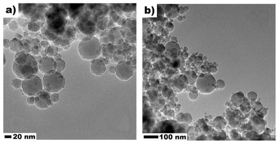 Transmission electron microscope (TEM) micrograph of nanosilica (NS) in high (a) and low (b) magnification, adapted with permission from ref. [].
