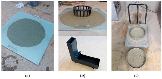 Test of fresh self-compacting concrete: (a) flowability and viscosity (slump flow test), (b) passing ability (J-ring and L-box), and (c) segregation resistance (sieve segregation test), reprinted with permission from ref. [].
