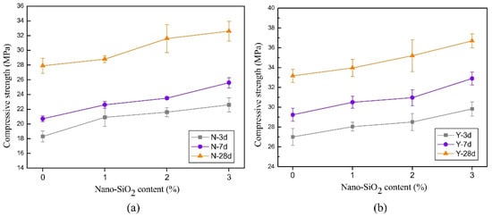 Compressive strength of LWAC with different nano-SiO2 dosages: (a) fly ash-clay ceramsite and (b) shale ceramsite, reprinted with permission from ref. [] Copyright 2018, Elsevier.
