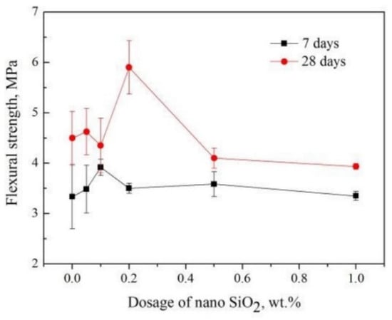 Flexural strength of lightweight concrete containing different low NS dosages after 7 and 28 days of curing. Adapted with permission from ref. [].