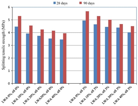 Similarly, Atmaca et al. [] reported a substantial influence of NS on the splitting tensile strength of high-performance lightweight concretes, regardless of the LWA content (Figure 9). For instance, after 28 days of curing, LWC containing 40% LWA and 3 wt.% NS achieved over an 16% higher splitting tensile strength than the reference LWC. Similar results were obtained for the modulus of rupture, meaning that is also influenced by the presence of NS [].