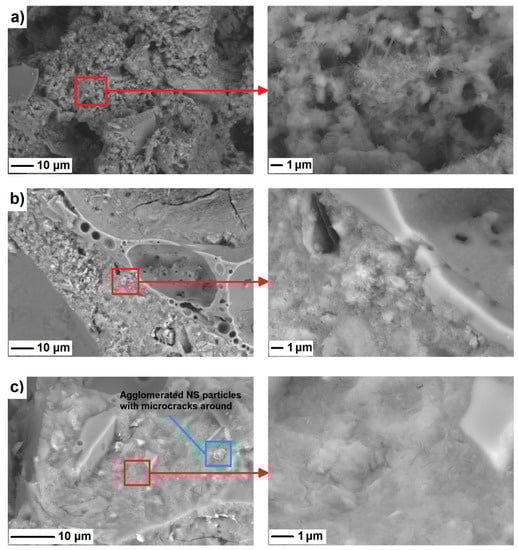 Scanning electron microscope micrographs of a sample (a) without NS, (b) with 2 wt.% NS, and (c) 4 wt.% NS after 28 days of curing, reprinted with permission from ref. [].