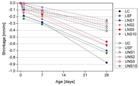 Experimental results of a drying shrinkage test of lightweight concrete (LC) and ultra-lightweight concrete (UC), and concretes with cement replacement by 1, 2, 5, ad 10 wt.% of NS and 10 wt.% of silica fume (LSF and USF), reprinted with permission from ref. [].