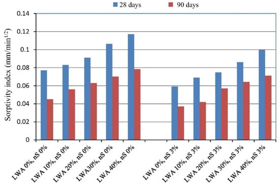 The effect of LWA and NS content on the sorptivity index of high-strength LWC. Reprinted with permission from ref. [] Copyright 2017, Elsevier.