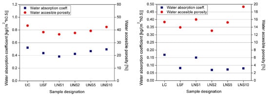 Water accessible porosity and water absorption coefficient of ultra-lightweight (left) and lightweight concretes (right) modified with 10 wt.% of silica fume (SF) and 1, 3, 5, and 10 wt.% NS after 28 days of curing, reprinted with permission from ref. [].
