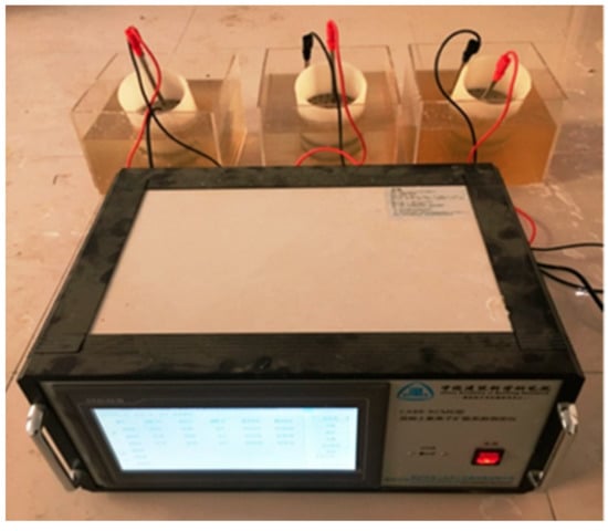 Another often applied method that allows for evaluating the durability of concrete is the ultrasound pulse velocity. Higher velocities obtained from the test indicate that the tested specimen has a low porosity, and thus a potentially higher durability []. For instance, Sadeghi Nik et al. [] reported that adding 2 wt.% and 4 wt.% nanosilica resulted in an increased ultrasonic pulse velocity, while higher amounts (6 wt.%) would not cause any significant increase. Another important parameter measured to determine the durability is the electrical resistivity of concrete, which reflects how concrete limits the movement of ions [,]. Studies done by Hornbostel et al. [] showed that the rate of corrosion increases with the decrease in electrical resistivity. The results of the electrical resistivity tests show that use of NS more than doubles the electrical resistivity, consequently decreasing the probability of corrosion occurrence. Other tests that can help to determine the durability of an element are the Rapid Chloride Penetration Test (RCPT) and Rapid Chloride Migration (RCM). Typical measurement equipment for RCM is shown in Figure 15. In principle, the results of these tests represent the electrical conductivity (or resistivity) of concrete, and the results obtained by Du are presented in Figure 16 []. For OPC concrete, there is a clear relationship between the concrete’s resistance against chloride and its electrical conductivity.