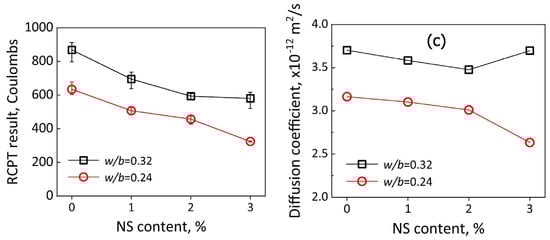 The study of Du et al. [] on the effect of the NS dosage (up to 3 wt.%) confirmed a beneficial effect of NS on LWC resistance against chloride ion penetration. RCPT confirmed (Figure 16) that the inclusion of NS resulted in a substantial reduction of electrical conductivity, as well as a diffusion coefficient for the different rates of water-to-cement ratios.