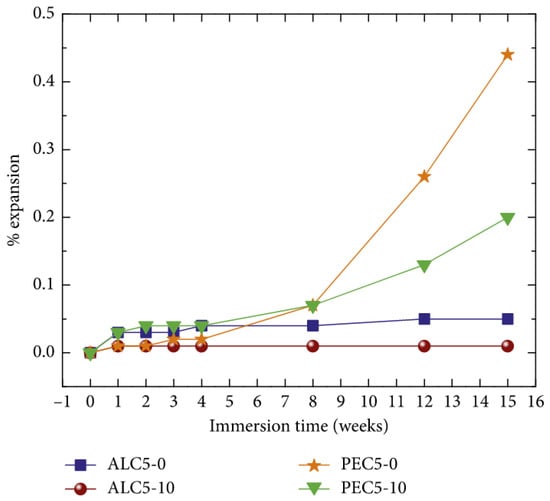 Vargas et al. [] evaluated the expansion of lightweight concretes produced with two types of LWAs (aliven and perlite) with (10 wt.%) and without NS (Figure 18) under sulfate attack (MgSO4). For up to 4 weeks, all of the specimens exhibited comparable expansion (Figure 18). Afterwards, clear differences were observed for different LWAs and NS amounts. The specimens containing the perlite aggregate (PEC5-0, PEC5-10) exhibited significantly higher expansion values than the LWC produced with the aliven aggregate (ALC5-0 and ALC5-10). The LWC produced with the perlite aggregate presented an increasing expansion for longer immersion times in sulfates, while in the case of the LWC containing aliven, no further increment of expansion was reported. The LWCs with the addition of 10% of nanosilica (PEC5-10 and ALC5-10) exhibited a lower expansion under the attack of magnesium sulfate. In the 15 weeks of testing, expansion of the reference PEC5-0 reached 0.44%, while NS-modified LWC (PEC5-10) exhibited an expansion of 0.2%. This effect was attributed to the previously described refinement of the concrete pore structure due to the NS presence, which resulted in decreased water absorption and voids volume. Moreover, because of the reaction of CH with NS, a lower CH content in the NS-modified LWCs was present. This, in turn, resulted in the limited possibility of brucite formation during the sulfate attack.
