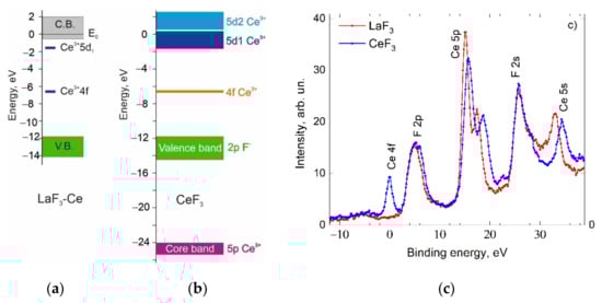 The location of energy levels in the cerium ion of LaF3 [57] (a), the tentative energy scheme for CeF3 (b) and the X-ray photoelectron spectra for LaF3 and CeF3 (c).