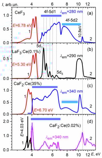 The evolution of the formation of the 5d2-conduction band can be understood by analyzing the luminescence excitation spectra of CaF2:Ce depending on the concentration of cerium ions [61]. For the CaF2:Ce (0.02 wt.%) sample in the region of 4–7 eV, there are bands corresponding to the intracenter 4f-5d transitions in the cerium ion. In the 7–10 eV region, the luminescence of cerium ions is not excited. Another situation is inherent for the CaF2:Ce (35 wt.%) sample. In the 7–10 eV region, an unstructured luminescence excitation band appears, which is characteristic for transitions from the 4f to 5d2 states of the conduction band in the CeF3 crystal. The appearance of such a structure in the luminescence excitation spectrum may indicate the formation of the CeF3 phase in the CaF2:Ce crystal (35 wt.%).