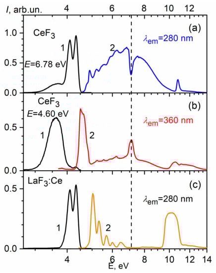 The nature of the peak at 10.8 eV (Figure 3a) may be due to the formation of the exciton states corresponding to the 2pF−→5d2 transitions. Exciton luminescence associated with the appearance of an anionic exciton is absent, possibly due to the deactivation of hole 2pF0-states by the electronic transitions from 4fCe3+ [60].