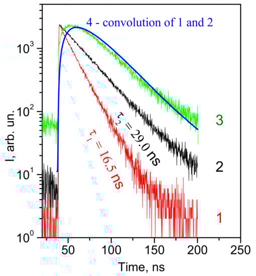 Additional information about the energy structure features of the CeF3 crystal conduction band can be obtained by analyzing the excitation spectra of the luminescence band at 340 nm (Figure 4b). The peculiarity of this luminescence is the presence of excitation bands in the transparency region of the CeF3 host. The luminescence excitation maxima are located at the absorption edge of the host at 4 eV and at 7.1 eV (Figure 4b). The last one is located in the region of the relative transparency of the host, where the exciting light falls in the energy gap between the 5d2- and 5d1-subbands of the conduction band. Therefore, the luminescence at 340 nm is excited mainly outside the region of fundamental absorption of the host in the energy range where regular cerium ions do not absorb. The intensity of this luminescence in the absorption region of 4f-5d1 transitions is much lower, and the luminescence, in this case, is rather due to the reabsorption of the 4f-5d exciton emission. The analysis of luminescence decay curves can approve it. Figure 4 and Figure 5 shows the luminescence decay curve of 4f-5d excitons (curve 1), the luminescence decay curve for the band at 340 nm for excitation in the region of host transparency (270 nm) (2) and in the region of 4f-5d exciton creation (λexc = 220 nm) (curve 3). The convolution (curve 4) of the exciton luminescence decay curve (curve 1) and the luminescence at 340 nm excited in the transparency region (curve 2) coincide with the decay kinetics of the band peaked at 340 nm excited in the host absorption region (curve 3). This coincidence confirms the radiative mechanism of the energy transfer from 4f-5d excitons to the radiation centers responsible for the luminescence at 340 nm. A similar conclusion about the mechanism of energy transfer has been made in [62].