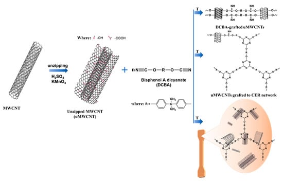 Multiwalled carbon nanotubes (MWCNTs) have excellent structural characteristics, are easy to functionalize, and can be used as reinforcement materials to improve the performance of polymer materials [8,9,10,11]. CER/MWCNTs nanocomposites have been recently developed and studied by several teams [12,13,14,15,16,17,18,19,20]. The catalytic effect of MWCNTs on CER polymerization was fixed, and CER/MWCNTs nanocomposites with improved mechanical and thermal properties and electrical and thermal conductivity have been elaborated. However, the matrix reinforcement of MWCNTs is not significant because the contact area between the carbon nanotubes and the matrix is limited, and the outermost nanotubes prevent the inner tubes from contacting the polymer matrix. [21]. Kosynkin et al. reported a representative way to form unzipped multiwalled carbon nanotubes (uMWCNTs) [22]. Since then, many reports have begun to use uMWCNTs as fillers to strengthen polymer composites [23,24]. Those demonstrated that uMWCNTs have outstanding physical enhancement properties and are superior to those of MWCNTs [25,26]. As a filler, carbon nanotubes can not only improve the brittleness of polymer, but also functionalize polymer materials.