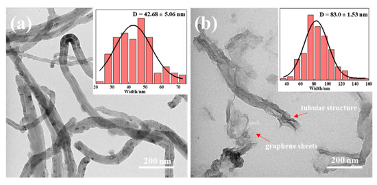 Unzipped multiwalled carbon nanotubes (uMWCNTs) is a portrayal description in references/publications [22], which indicates the geometric change of CNTs. In this unzipping process, the oxidation of pristine CNTs is the chemical cause to initiate this morphological structural change of MWCNTs. It should be noted that in this process, the one-dimensional MWCNTs are destroyed and changed into open morphological structures with different geometric shapes, as shown in Figure 2. The TEM images of pristine MWCNTs and unzipped MWCNTs show that the morphology of the carbon nanotubes changed significantly after their unzipping. As shown in Figure 2, the pristine MWCNTs can be seen with smooth outer contours and the tubular structure is obvious. Compared with pristine MWCNTs, the length of uMWCNTs became shorter after strong oxidation method processing, and the outer walls were partially loosened or unwrapped, or even fell off from the surface of the nanotubes to form graphene nanosheets, thus increasing the surface area of MWCNTs. Instead of forming flat graphene sheets, however, they show a tubelike structure. The size distribution of the outer width for the MWCNTs and uMWCNTs in the diagrams inside the corresponding TEM images also illustrated this phenomenon. Figure 2 shows that the pristine MWCNTs have inherent hollow tubular structure with the average outer width of D = 42.68 ± 5.06 nm, while the average outer width of uMWCNTs is D = 83.0 ± 1.53 nm. One can see that the width of uMWCNTs is almost twice compared to that of MWCNTs, indicating effective unzipping [22]. The increase of the width of carbon nanostructures not only provided a larger surface area for the binding of polymer resin to carbon nanotubes, but also increased the number of groups available on the edge and surface of MWCNTs for further improvement of effective matrix/filler interaction and the dispersion stability.