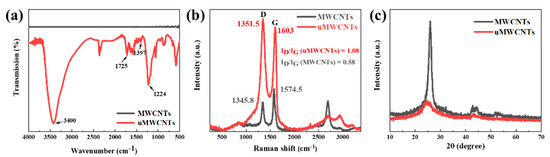 Figure 3. FTIR spectra (a), Raman spectra (b) and XRD patterns (c) of MWCNTs and uMWCNTs.