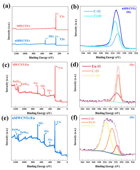 Figure 4. XPS spectra of MWCNTs (a); uMWCNTs (b,c); MWCNTs/Eu (d,e); uMWCNTs/Eu (f).