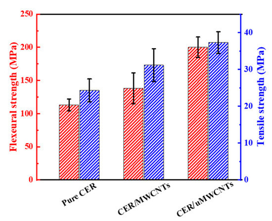 As shown in Figure 6, the mechanical properties of CER network are enhanced strongly with the addition of MWCNTs or uMWCNTs. The flexural strength and tensile strength of the CER/MWCNTs nanocomposite were 120.75 MPa and 31.17 MPa, respectively, and increased by 33.0% and 24.4%, respectively, compared to the pure CER network. The effect of uMWCNTs is similar to the trend of CER/MWCNTs but the enhancement is more pronounced. It was found that the values of flexural strength and tensile strength of the CER/uMWCNTs nanocomposite were 160.07 MPa and 37.79 MPa, respectively, which are 32.6% and 21.3% higher than that of CER/MWCNTs nanocomposites, respectively. Compared with pure CER network, the flexural strength and tensile strength are increased by 76.3% and 50.9%, respectively.