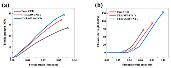Figure 7. Tensile stress–strain curves (a) and flexural stress–strain curves (b) of the pure CER network, CER/MWCNTs and CER/uMWCNTs nanocomposites.