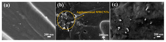 SEM images of tensile fracture of CER/uMWCNTs nanocomposites were also used to further characterize the dispersibility of uMWCNTs and possible strengthening mechanism. Figure 8 shows the scanning electron microscope (SEM) cross-sectional image of the nanocomposite. On the one hand, as shown in Figure 8b some agglomerations of MWCNTs in in the CER/MWCNTs nanocomposites are observed. The agglomerated regions of MWCNTs were easy to cause crack propagation. However, the dispersion of uMWCNTs in CER/uMWCNTs nanocomposites is more uniform (Figure 8c), which is conducive to the improvement of toughness. On the other hand, it can be seen that the MWCNTs have been pulled out of the matrix. Thus, we supposed the reinforcement effect is mostly pulling-out mechanism because the interaction force between MWCNTs and CER resin matrix was weak. However, the different situation can be found from the CER/uMWCNTs as shown in Figure 8c, in which the broken image of uMWCNTs is shown by the very short bright dots (Figure 8c). Obviously, the binding force between the uMWCNTs and the CER matrix was enhanced due to the increased surface area from unzipping procedure as well as the increased polar oxygen-contained groups at surface of uMWCNTs.