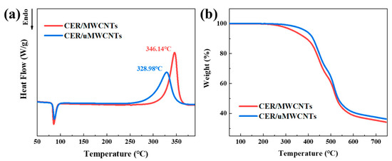 The DSC measurements of CER/MWCNTs and CER/uMWCNTs nanocomposites were performed and the thermograms are given in Figure 9a. It can be seen that the MWCNTs or uMWCNTs were added to the CER monomer, the temperature positions of the peaks were 346.14 °C or 328.98 °C, respectively. This phenomenon proves that MWCNTs had a strong catalytic effect on CE polymerization and formation of CER network inside the nanocomposites [48]. At the same time, the melting enthalpy (ΔHm) of CER/MWCNTs was 84.87 J/g, while this value decreased to 78.02 J/g with the addition of uMWCNTs and the enthalpy of formation (ΔHs) of CER/MWCNTs and CER/uMWCNTs nanocomposites were 718.09 J/g or 692.82 J/g, respectively. The difference between uMWCNTs and MWCNTs was that the surface area of uMWCNT was larger, and there were many polar groups such as –OH group and –COOH group on the surface.