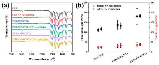 Some changes in polymer properties, such as mechanical properties, were associated with UV irradiation [49]. IR spectroscopy (Figure 10a) shows the effect of UV irradiation on structure of the composites. Figure 10a displays the FTIR of pure CER, CER/MWCNTs and CER/uMWCNTs nanocomposites before and after UV irradiation. CER network contained many triazine rings formed at polycyclotrimerization of cyanate monomer. The FTIR spectra of the pure cured CER and nanocomposites before and after UV irradiation shows that the peaks of triazine rings at 1570 cm−1 (–C–N=C–) and at 1370 cm−1 (–O–C=N–) remained unchanged. This obviously indicated that neither MWCNTs nor uMWCNTs could change the UV stability of CER, and thus the composites had also obtained excellent UV aging performance.