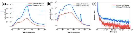 Photoluminescence spectra of CER/MWCNTs/Eu, CER/uMWCNTs/Eu nanocomposites were recorded. To improve the photostability of the complex, the complex was first doped with carbon nanotubes and then compounded into the resin matrix (see Section 2.2.1). Luminescence excitation and emission spectra of each component (CER, MWCNTs, uMWCNTs and Eu) of the composites are shown in Figure S2 and Figure 11 shows the excitation and emission spectra of the cured CER doped with MWCNTs/Eu and uMWCNTs/Eu. After curing, the photoluminescence spectra of CER/MWCNTs/Eu, CER/uMWCNTs/Eu in Figure 11b distinguished luminescence peaks at 614 nm, indicating the emission characteristics of europium complexes according to the following transition 5D07F2 (614 nm); however, other transitions were concealed. On the other hand, with the formation of CER network in polymerization process, the luminescence emission spectrum of resin gradually appeared as a wide emission band around 500 nm, which indicated the emission of conjugate aromatic network. As shown in Figure 11b, the intensity of resin emission band even overwhelmed that at 614 nm from the europium complex. At this situation, the emission of europium complex became luminescence behind the visible (FBV), which could impart the embedment of photon quantum information into potential application target. Figure 11a,b indicates that the luminescence intensity of CER/uMWCNTs/Eu is higher than that of CER/MWCNTs/Eu with the same luminescence hybrid material content.