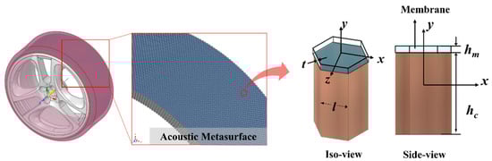 Highly reflective AMSes were specifically designed for this frequency range, as shown in Figure 1. AMSes are fabricated using silicone rubber and are composed of a honeycomb-shaped core panel attached to a tire′s rim. In Figure 1, for the unit cell, am is the side length of the hexagon, t is the wall thickness of the core panel, and hm and hc are the thickness of the thin plate and the height of the core panel, respectively. Hexagonal unit cell-shaped metasurfaces have a natural oscillation mode at higher frequencies than squares and triangles with identical unit cells with hydraulic diameters. Moreover, the shape and form of the periodic metasurfaces with hexagonal unit cells are not deformed across a tire’s curved plane. This also offers the best surface filling fraction, which is ideal for noise suppression. The unit cell can be considered as a clamped thin plate because the core panel is relatively rigid. Thus, when the noise occurs, the thin plate oscillates and propagates acoustic pressure while barely passing through the core panel. The effectiveness of the unit cell hexagonal cross section was evaluated to predict the acoustic characteristics of the AMSes. Through Rayleigh′s method of a spring and a mass, the effective dynamic mass density, ρeff, can be determined using the following deceptively simple equation [19,20]: