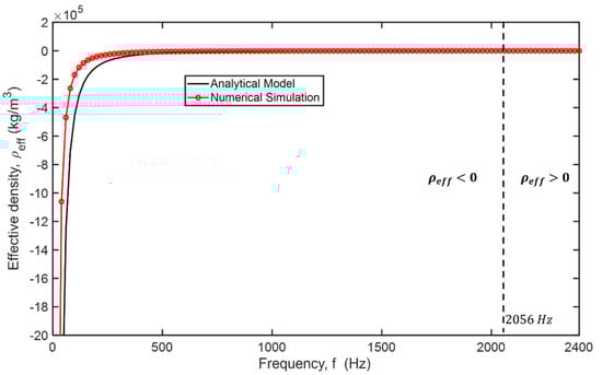 The effective dynamic mass density of an AMS, including an elastomeric thin plate having an eigenfrequency of 2,056 Hz, was obtained from Equation (1) and the numerical simulation using COMSOL Multiphysics when hm = 0.5 mm, Em = 7 MPa, ρm = 1070 kg/m3, νm = 0.49, and am = 3.65 mm (see Figure 2). The effective dynamic density can be numerically obtained by dividing the out-of-plane surface averaged stress, , by the product of the surface averaged acceleration, , and the thin plate thickness, hm, i.e., where the y-axis is the direction of wave propagation [20].