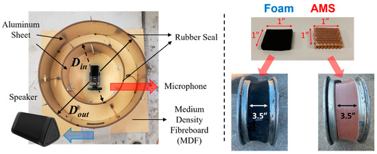 Various experimental techniques have been used to measure the soundproofing capability in the lab, e.g., directly measuring sound with microphones in the cavity resembling the actual structures [7,33], or indirectly measuring vibration of the structures induced by the impact [34]. The cavity model was used for the lab test due to its simplicity and convenience. The manufactured AMSes were attached to the inner layer of the tire cavity model, mimicking a real tire, 235/65R18, for the lab test referring to O’Boy’s design [7], and the rim of each tire (Pirelli Tires), 185/65R15, of the Toyota Prius hybrid 2008, for the field test. The tire cavity model consisted of medium density fibreboard (MDF), aluminum metal sheets, and acrylic panels, as shown in Figure 3 (left). The outer and the inner metal sheets represent the tire rubber and the rim of a wheel where the outer and inner diameters are Do = 30″ and Di = 18″, respectively. The thickness values of Al sheets, MDF, and acrylic panels, are 0.060″, 0.750″, and 0.437″, respectively. We added a rubber seal to the edge of the aluminum sheets to isolate the cavity. The Rode NT-USB mini microphone (RØDE Microphones LLC, Long Beach, CA, USA), which has a sampling rate of 48 kHz and a frequency range of 20 Hz–20 kHz, was mounted in the center of the inner cavity and connected to the computer with the USB cable. A hole was made at the bottom for a speaker emitting white noise which was generated by the Minirator MR2 audio generator from NTi Audio (NTi Audio AG, Schaan, Liechtenstein), which has a resolution of 0.1 Hz. The foam and the AMS were bonded on the circumference of the rim, 3.5″ width. The densities of the foam and the AMS are approximately 10.0 lb/ft3 and 14.5 lb/ft3, respectively.