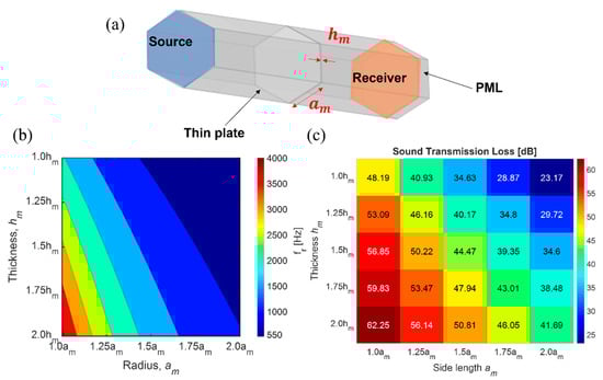 The unit cell′s parametric study was carried out using the numerical simulation (COMSOL Multiphysics) with the pressure acoustics and the solid mechanics modules to predict the effect of the design parameters on acoustic properties, such as dynamic mass density and STL. The thickness, hm, and side length, am, of the thin plate were examined. The clamped hexagonal thin plate was considered the unit cell of the AMS, and the linear elastic model for the silicone rubber was occupied. Figure 4a illustrates the geometry of the unit cell, where the thin plate is placed in the middle of the pipe. The maximum element size of the pipe is 0.1λ where λ is the wavelength. The number of elements along the thickness of the thin plate is five. Before and after the thin plate there are boundary layers regarding viscous layer thickness. The perfectly matched layer (PML) is placed on the back of the receiver side to avoid the reflection from the wall. The boundary condition of the sidewall is hard wall. On top of the pipe, the plane wave propagates through the structure. Then, the transmitted sound pressure was measured at the bottom.