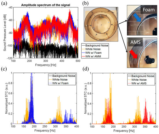The AMS feasibility was demonstrated by constructing a tire cavity representing an actual tire (235/65R18), as shown in Figure 3. The model consisted of MDF, aluminum metal sheets, and acrylic panels. The outer and the inner metal sheets represent the tire rubber and the rim, respectively. The Rode NT-USB mini microphone was mounted in the inner cavity. A hole at the bottom facilitated the generation of white noise via a speaker. Figure 5 shows the effects of noise reduction due to the AMSes. Figure 5a shows the acoustic spectrum in log scale, and Figure 5c,d depict the sound transmission coefficients (STCs) normalized to the maximum sound transmission of the white noise of the cavity mode. Figure 5b illustrates the tire cavity with foam and AMS.