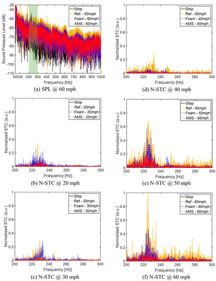 The temporal sound pressure was measured for 19 s with a Rode NT-USB mini microphone, and the recorded data were processed with the fast Fourier transform (FFT) to obtain the frequency spectrum of the sound pressure level (SPL) from 50 Hz to 1,000 Hz as shown in Figure 6a. The cavity mode occurs near 230 Hz, as expected. Although both foam and AMS show noise reduction effects, the SPL of AMS is 2–3 dB more than foam and is significantly higher. The frequency range under consideration ranged from 200 to 300 Hz as the tire air cavity mode appears near 230 Hz. The frequency spectrum of the sound transmission coefficient (STC) at various vehicle speeds is shown in Figure 6b–f. STC is normalized by the peak of the cavity mode at 60 mph. For low speed at E.V. mode, 20–40 mph, the cavity mode′s peak values are similar but the noise at other frequencies induced by engine increases as the vehicle speed increases.